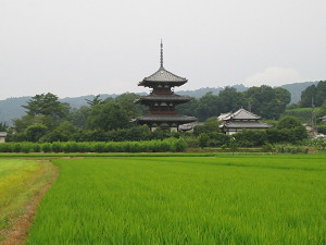 そのまままっすぐ進むと遙か向こうに法起寺の三重の塔が見えてきます。 周りに遮るものが何もないので、思わず感動してしまう景色です。