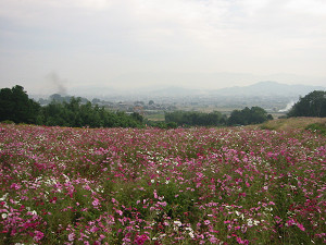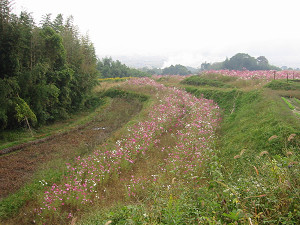 一言主神社へ向かう道。10月下旬頃だと一面のコスモスが見られる。 少し高台になっているのでコスモスを見ながら町並みを眺めることもできる。