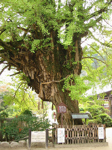 神社というとどこでもありますよね。ご神木の大木。樹齢1200年!? ここのは「乳銀杏」です。枝の付け根がコブ状になって”乳”のようだからだそうですが。 この木をさすると乳の出が良くなるそうです。え?関係ない?