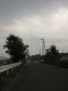 案内板立っていました。ここを左に曲がります。この日は突然の雨。 天気予報では降るなんて言っていなかったのに…。傘がないのでぬれていきましょう(^^;。 「秋雨(?)じゃ、ぬれていこう。」とほほ…。(2003年11月撮影)
