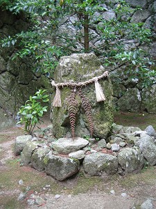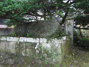 神社の階段の左脇にあります。…亀といわれても亀に見えない…どうしたものか。