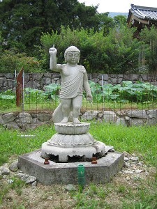 橋本院は本当に清楚なお寺です。何だか心がのんびりしてきます(^^)。 お庭に釈迦誕生像がありました。例の天と地を指さしているあれです。「天上天下、唯我独尊」ですね。