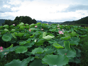 雨上がりできれいな蓮が咲いていました。葛城山系の山々を背景にピンクが映えていました。 (2009年8月初旬撮影)
