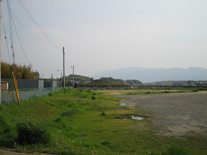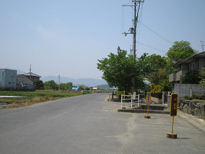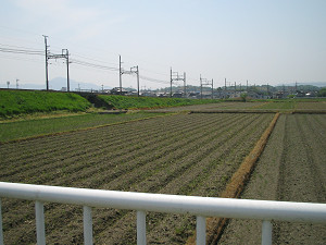 近鉄線を越えたら左手のフェンスに注意。 県道274号線に出る少し手前にフェンスの切れているところがあります。 そこから田んぼの間の道へ下りましょう。ここを通って274号線へ。