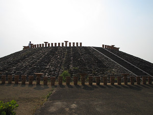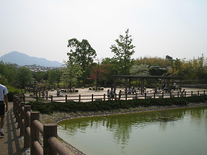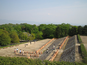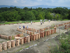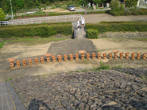 たくさん並んだ素焼きの円筒埴輪は地元の人の手作りらしい。 ただ人が通るところにある埴輪は破損を防ぐためにプラスチック製になっている。