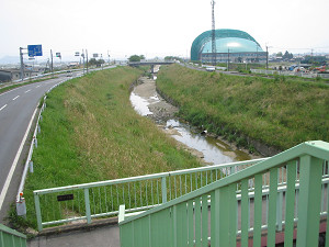 左へ右へ寄り道した後、再び県道112号線を通って葛城川に戻ります。 広陵運動公園向かい側のこの歩道橋で川の西側へ渡りましょう。(左端に見える道路は県道277号線)