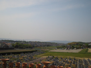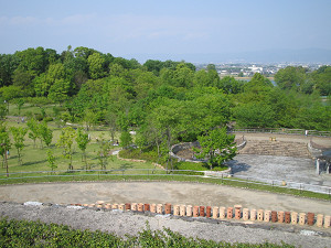 古墳の上から北側を見たところ。奥に見えるのが竹取公園。