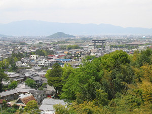 狭井神社あたりから三輪の大鳥居と耳成山。