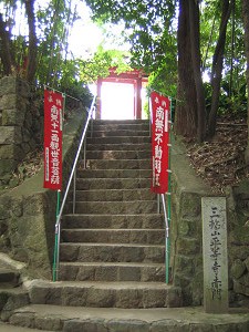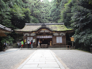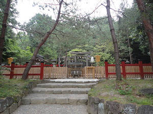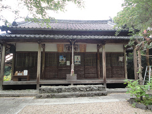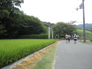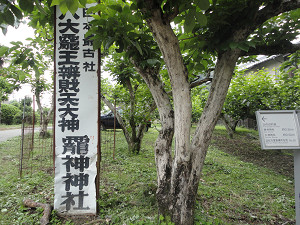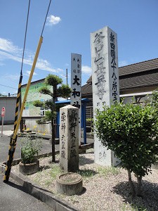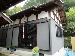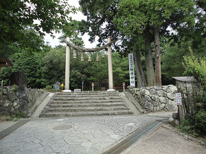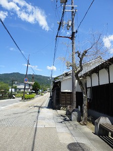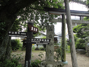 石畳の急な下り坂を下りて左に曲がると夜都岐神社が見えます。