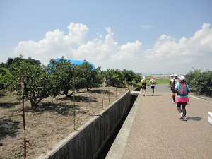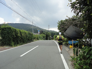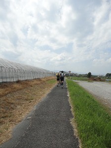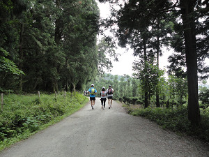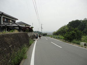 少しの間、車道路を走ります。車に気をつけて一列で走りましょう。