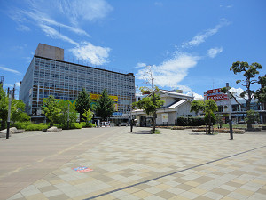 広場にはきれいなトイレもあります。正面に見えるビルの右側が本通商店街の入口。